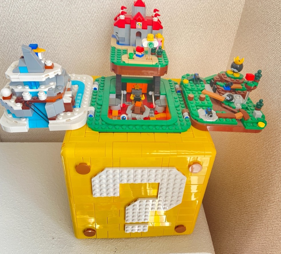 写真は力作のマリオのはてなブロックです。上部にコースが並んでいます。ちまちま作って半年かかりました。